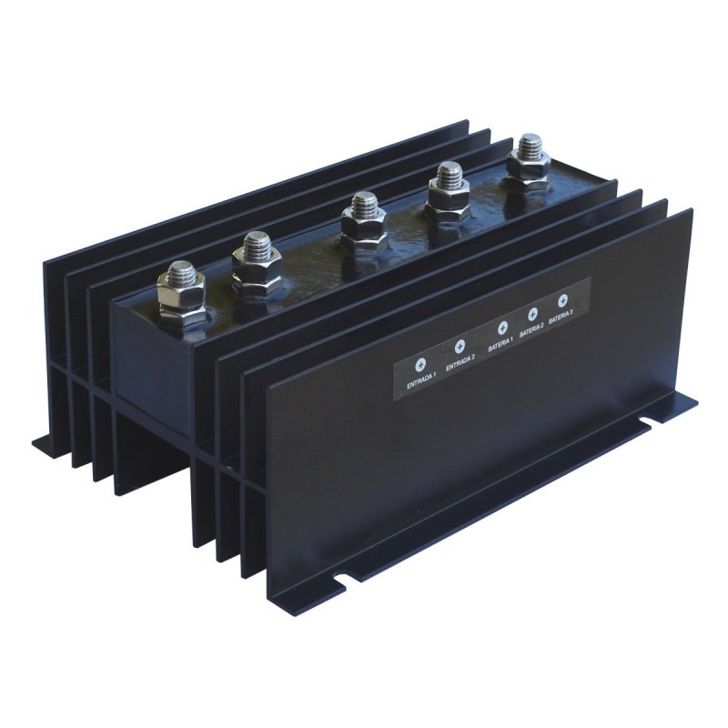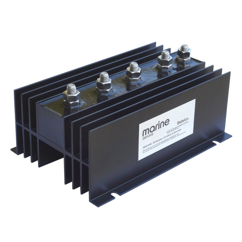 Os divisores para baterias (battery isolators) batelco são apresentados em duas potencias diferentes, 60 e 120 A, para tensões de até 100 VDC. Possuem sensores para tensão reversa para ser utilizado com todos os tipos de carregadores de baterias ou alternadores. Os divisores Batelco são totalmente isolados com referência a sua carcaça (radiador) evitando assim acidentes como o contato com qualquer outro componente.